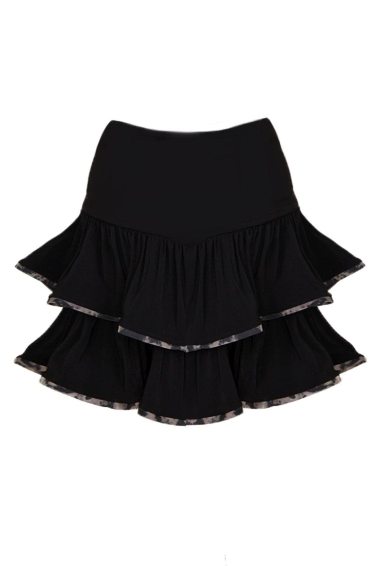 Kadın Siyah Katlı Volanlı Mini Etek